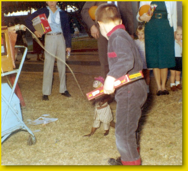 A monkey is entertaining the crowd. Two little children cower behind their mother's skirt. An older kid is holding two presents... hey! That's not fair! I can't make out what either of them are.