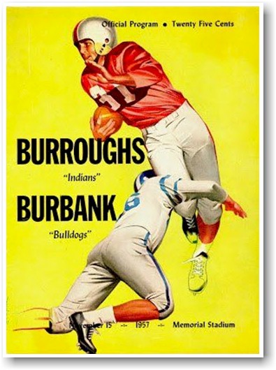 1959 - Burroughs 19, Burbank 0. Trading shutouts again, the Indians scored their fourth win with an assist from Burbank, who was forced to use many J.V. players after having 19 of the varsity members declared ineligible for the game for "egging" the mural over the Burroughs Auditorium. Conde Lick and Brent Vance led the Indians with a TD each.