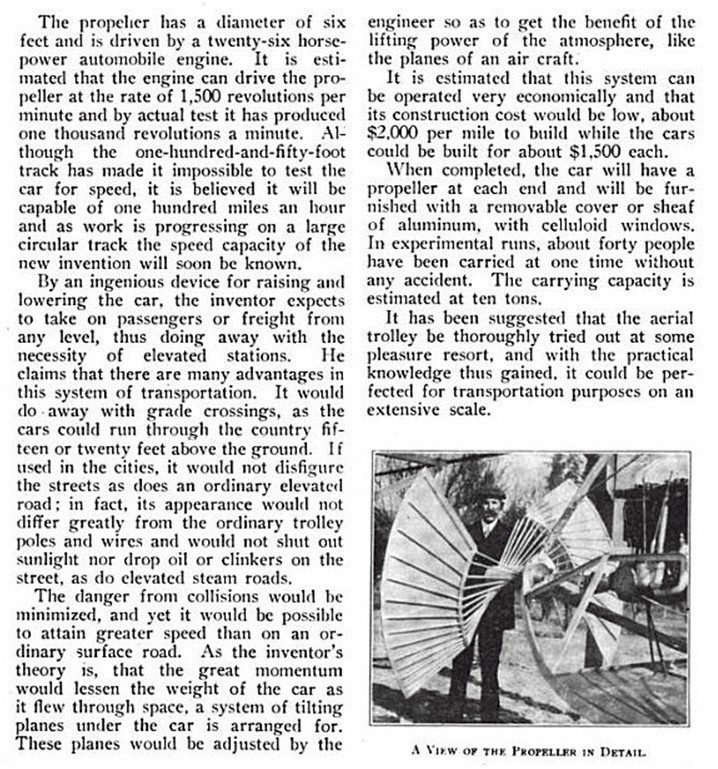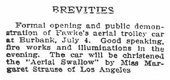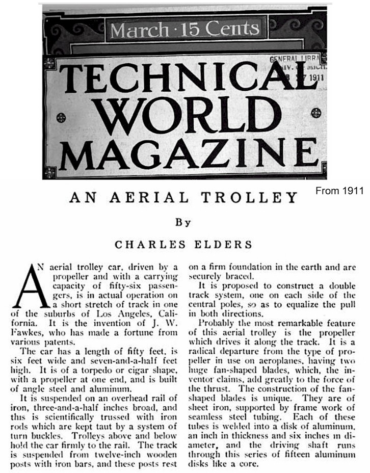 Did you know that Burbank may have been the site of the world's first aerial trolley car experiment in 1911? From "History of Burbank" on the city's website: "The population of the town was 500 when the voters approved incorporation in 1911. That same year, civic boosters began a campaign to have the Pacific Electric Streetcar line extended from Glendale into Burbank. The citizens of Burbank had to put up a $48,000 subsidy to get the reluctant P.E. officials to agree. The first Red Car rolled into Burbank on September 6, 1911. Leading the opposition to the public fundraising was J.W. (Joseph Wesley) Fawkes, who had patented the first monorail car in the United States. He built a prototype on his Burbank ranch, running a line between Lake and Flower Streets. Fawkes called his invention the "Aerial Swallow." City officials, however, called it "Fawkes' Folly" and the proposed monorail system never materialized." That exposed propeller looks like a major safety concern!