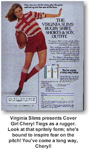 Cheryl Tiegs, Rugger - When feminism is funny. From a 1982 Virginia Slims ad.