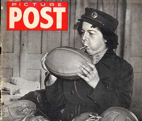 Picture Post - I got this one from the British rugby writer Master William Webb Ellis, who writes, "Hi Wes, Seeing as you've kindly agreed to let me steal some of your pictures, I thought I'd return the favour. Hope this one is esoteric enough to be included in your Gallery, but I'd quite understand if it doesn't light your candle. I came across this by accident. It's the front cover of 'Picture Post' magazine, specifically the Volume 5, No. 6 issue dated 11 November 1939. Caption not included in the picture reads, 'ONE MORE BLOW FOR HITLER! A girl of the A.T.S. blows up a football at the 'Army Comforts' headquarters in Berkshire.' Army comforts? A woman getting her mouth around some balls? Further comment from me at this stage would surely only lower the tone. All the best, William Webb Ellis."